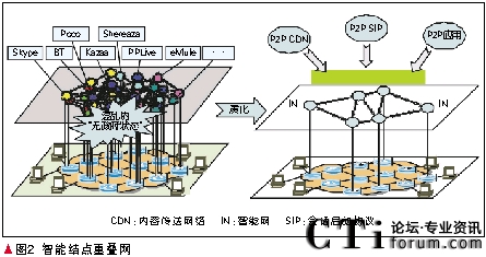 智能節(jié)點(diǎn)重疊網(wǎng)是覆蓋在IP核心網(wǎng)上的傳統(tǒng)的彈性重疊網(wǎng)(RON)技術(shù)與分布式哈希表(DHT)技術(shù)相結(jié)合的新型重疊網(wǎng)技術(shù),包括自動組網(wǎng)、網(wǎng)絡(luò)資源管理、路由優(yōu)化等關(guān)鍵技術(shù)。其基本結(jié)構(gòu)是保持TCP/IP協(xié)議不變,原來的3層變成3-層,在其上建立一個智能結(jié)點(diǎn)重疊網(wǎng)做為3+層,在此分布式管理平臺上提供流量監(jiān)控、流量控制、QoS、病毒防止和安全性等服務(wù)。智能結(jié)點(diǎn)重疊網(wǎng)的另外一個任務(wù)是為各種P2P應(yīng)用提供支撐環(huán)境。它可以為在互聯(lián)網(wǎng)上采用不同協(xié)議和軟件的各種P2P業(yè)務(wù),提供統(tǒng)一的支撐環(huán)境。主要是提供P2P CDN和P2P SIP。智能結(jié)點(diǎn)重疊網(wǎng)如圖2所示。
