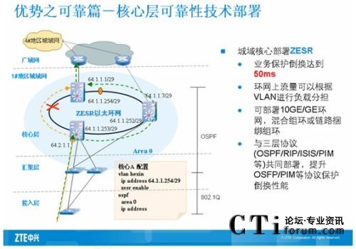 核心交換機(jī)主要是匯聚下行的全千兆智能路由交換機(jī),所以要求設(shè)備提供高密度板卡和線速轉(zhuǎn)發(fā)的能力。同時(shí)保證對下行端口進(jìn)行帶寬控制,中興采用萬兆路由交換機(jī)ZXR10 8905來滿足用戶的需求。ZXR10 8900系列萬兆路由交換機(jī)是中興通訊推出的新一代的大容量核心/匯聚路由交換機(jī)系列產(chǎn)品,主要定位于運(yùn)營商IP城域網(wǎng)、校園網(wǎng)、電子政務(wù)網(wǎng)和大型企事業(yè)網(wǎng)等網(wǎng)絡(luò)的核心/匯聚層。ZXR10 8900系列萬兆路由交換機(jī)基于先進(jìn)的模塊化理念進(jìn)行設(shè)計(jì),并采用了基于多處理器并行處理機(jī)制和Crossbar空分交換結(jié)構(gòu)的體系結(jié)構(gòu),關(guān)鍵模塊均采用可以1:1進(jìn)行冗余備份。ZXR10 8900系列具備10GE、GE、FE等各種豐富的接口模塊,并全面支持IPv4、IPv6、組播、QOS、帶寬控制等業(yè)務(wù)功能。ZXR10 8900系列整個(gè)系統(tǒng)所具備的高可靠性、高擴(kuò)展性、良好的業(yè)務(wù)能力等特點(diǎn),可以滿足各種網(wǎng)絡(luò)核心/匯聚層的建設(shè)需求。