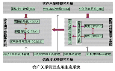 根據(jù)目前IT產(chǎn)業(yè)領(lǐng)域和管理界對(duì)CRM的開發(fā)、討論及應(yīng)用的經(jīng)驗(yàn)和反饋,綜合來講,一個(gè)完整的客戶關(guān)系管理應(yīng)用系統(tǒng)由如下四大生態(tài)子系統(tǒng)組成: