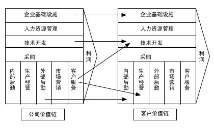 企業(yè)的主要活動(dòng)都是具有相應(yīng)價(jià)值的,這些活動(dòng)構(gòu)成了企業(yè)的價(jià)值鏈,企業(yè)價(jià)值鏈?zhǔn)紫缺憩F(xiàn)為企業(yè)內(nèi)部的聯(lián)系和支撐,各種活動(dòng)相互配合,才能產(chǎn)生價(jià)值和利潤(rùn);其次,企業(yè)的活動(dòng)和上游供貨商和下游用戶緊密聯(lián)系,相互影響。顯然,供貨商、用戶的各種活動(dòng)方式能夠直接或者間接地影響企業(yè)的成本、利潤(rùn)和競(jìng)爭(zhēng)優(yōu)勢(shì),同樣,企業(yè)的各種活動(dòng)也將對(duì)它們產(chǎn)生很大的影響。
