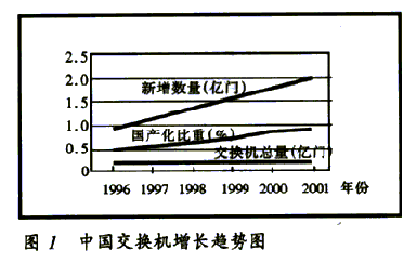 2000年,中國公用通信網(wǎng)上局用程控交換機的總容量達到1.79億門,國內(nèi)生產(chǎn)設備的比重達80%。預計2001年新增交換機容量2100萬門,總容量達到2億門,國內(nèi)生產(chǎn)設備的比重超過85%,增長趨勢見圖1。