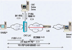 在網(wǎng)通有限公司為中建總公司建設的網(wǎng)絡中,當用戶撥上網(wǎng)絡時,網(wǎng)通有限公司的認證系統(tǒng)會根據(jù)帶域名的用戶名確定是哪個地區(qū)的VPDN用戶,并通過一系列步驟實現(xiàn)用戶與企業(yè)之間的內(nèi)部通信。