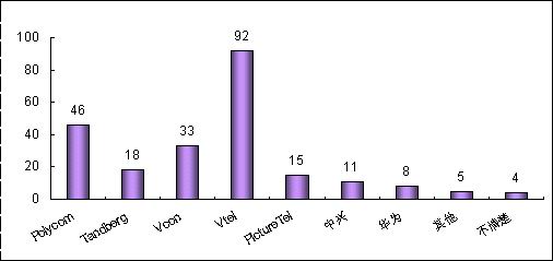 各品牌的認知度與其市場銷售情況息息相關(guān)。例如,VTEL是最早進入中國市場的視頻會議廠商,并在相當長的時期內(nèi)占據(jù)市場領(lǐng)先地位,取得顯著的品牌認知度是有其廣泛用戶基礎作為支撐的;POLYCOM雖然從1998年才開始進軍中國市場,但在基于IP的視頻會議系統(tǒng)的市場爭奪中取得較好的成績;PictureTel已經(jīng)被POLYCOM收購,品牌認知度也相對較低;而國內(nèi)品牌中興、華為剛剛起步,也很難達到較高的認知度。