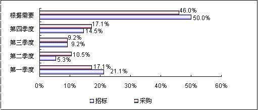 賽迪顧問針對視頻會議終端系統(tǒng)用戶招標與采購的調(diào)查表明,用戶招標與采購的季節(jié)性差異比較明顯,除了將近50%的用戶會根據(jù)需要在不確定的時間里進行招標和采購以外,第一季度和第四季度成為用戶招標和采購相對集中的時間段,這與許多其他商用IT產(chǎn)品的采購類似。具體到招標和采購的月份,10月份成為最為集中的時間。原因在于,視頻會議終端系統(tǒng)的采購受行業(yè)用戶的資金規(guī)劃與使用的影響顯著。第一季度往往是各企事業(yè)單位資金充裕的時期,到了第四季度又是政府部門為完成本年度信息化建設的任務,往往產(chǎn)生比較集中的設備采購。