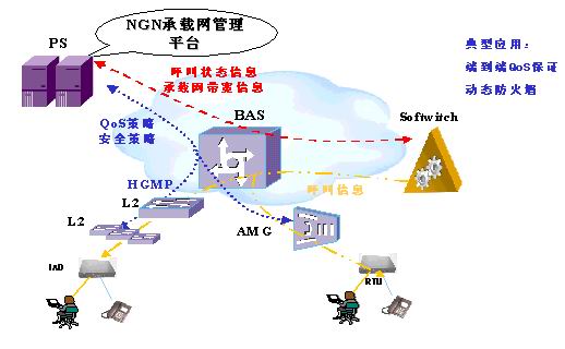 所有用戶接入BAS,BAS通過CAR可以對(duì)不同的用戶限制帶寬,PC分配較低的優(yōu)先級(jí)及帶寬,而對(duì)IAD分配較高的優(yōu)先級(jí)和帶寬,防止普通用戶對(duì)帶寬的無(wú)節(jié)制濫用。PS可以動(dòng)態(tài)收集BAS設(shè)備的帶寬使用情況,同時(shí)通過與軟交換的交互,了解NGN業(yè)務(wù)的帶寬需求,從而在BAS上可按用戶及業(yè)務(wù)的粒度進(jìn)行動(dòng)態(tài)QoS策略配置,為用戶提供差異性業(yè)務(wù),保證用戶的SLA。PS可以下發(fā)QoS策略給BAS,BAS交換機(jī)可以進(jìn)一步通過協(xié)議(各廠家私有協(xié)議)下發(fā)QoS策略給下掛的L2交換機(jī)。