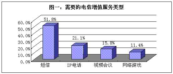 當(dāng)用戶被問到“最需要的電信增值服務(wù)是什么?”,在短信、IP電話、視頻會議和網(wǎng)絡(luò)游戲這四個備選項當(dāng)中,超過一半的被訪者選擇短信;其次是IP電話,選擇此項的被訪者占據(jù)21%;再是視頻會議,選擇此類多媒體通訊方式的被訪者約占16%;最后是網(wǎng)絡(luò)游戲,需要此類增值服務(wù)的人約為10%。(見圖一)