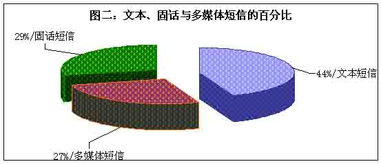 目前市場的主流短信主要有三大類,即傳統(tǒng)的手機文本短信、流行的圖音文字兼?zhèn)涞摹安市拧焙托峦瞥龅墓淘挾绦。整個短信市場確實火了,但是在火爆的背后哪一種短信是真正的巨無霸?調(diào)查表明,在三類短信之中,選擇文本類短信的用戶最多,占據(jù)44%,其次是固話短信,再次是多媒體短信,即俗稱的“彩信”,選擇固話短信和彩信的百分比十分接近。(見圖二)看來,“巨無霸”非文本類短信莫屬。