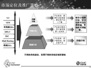 為了打開網(wǎng)通視訊業(yè)務(wù)的局面,網(wǎng)通的推廣方案也非常完備,這位負(fù)責(zé)人向記者出示了一張圖(見左下圖),詳細(xì)地解釋了網(wǎng)通視訊業(yè)務(wù)的市場(chǎng)定位及推廣策略。首先是通過(guò)媒體宣傳給客戶以整體印象,力求覆蓋面廣,眾所周知; 接著以直郵形式有針對(duì)性地發(fā)放詳細(xì)單頁(yè)資料,深入宣傳;然后以小型研討會(huì)、技術(shù)講座等形式,有針對(duì)性地召集當(dāng)?shù)啬繕?biāo)客戶/潛在用戶,細(xì)論VC市場(chǎng)及產(chǎn)品; 最后是以巡展、樣板客戶案例造聲勢(shì),提高產(chǎn)品形象。
