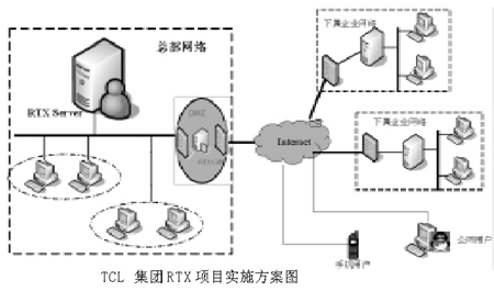 為充分發(fā)揮現(xiàn)有信息基礎(chǔ)設(shè)施和IT應(yīng)用的作用,促進(jìn)企業(yè)的實(shí)時(shí)商務(wù)運(yùn)作,節(jié)約開支,集團(tuán)公司在廣泛調(diào)查實(shí)時(shí)企業(yè)IM軟件的基礎(chǔ)上,于2002年10月對(duì)騰訊公司的RTX實(shí)時(shí)應(yīng)用軟件前身BQQ進(jìn)行了嚴(yán)格的評(píng)估和論證,認(rèn)為在如下幾個(gè)方面騰訊公司的企業(yè)IM軟件能夠解決TCL集團(tuán)公司面臨的實(shí)際問題:①業(yè)務(wù)地點(diǎn)分散,網(wǎng)絡(luò)結(jié)構(gòu)復(fù)雜;②業(yè)務(wù)復(fù)雜,無法形成集中統(tǒng)一的工作流管理系統(tǒng);③人員素質(zhì)差異性較大,復(fù)雜的IT應(yīng)用如OA系統(tǒng)等應(yīng)用推廣受到一定阻力;④集團(tuán)內(nèi)部缺乏一個(gè)公共實(shí)時(shí)交流平臺(tái),企業(yè)內(nèi)部溝通不暢;目前集團(tuán)公司內(nèi)部主要通過電話、傳真和E_mail這些傳統(tǒng)工具傳遞信息,企業(yè)的實(shí)時(shí)化大受影響。而且騰訊公司的RTX產(chǎn)品投入低,上手快,于是TCL集團(tuán)領(lǐng)導(dǎo)決定上馬RTX項(xiàng)目,自上而下推廣RTX項(xiàng)目。