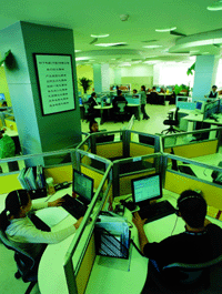 “目前這里每天要處理2000多個電話,一個月的電話量累計高達8萬個。每個坐席代表平均每天處理電話60次左右!彼上码娖鳎ㄖ袊┯邢薰矩撠熀艚兄行臓I運的CRM推進部副部長陳文凱說,“這是一個不輕松的工作崗位,因此,坐席代表的工作環(huán)境和工作待遇得首先得到保證。只有讓他們心情愉快,他們才能笑著去服務(wù)客戶。”這個寬敞舒適的工作大廳,就是基于這樣的思路設(shè)計出來的。每個坐席代表置身于扇形柔色的工作空間內(nèi),既能精力集中,又能避免回復(fù)電話的聲音互相干擾,一定角度的扇形空間發(fā)揮了最大的吸音效果。在大廳旁邊,還專設(shè)坐席代表休息室,每工作2小時后,他們可以到休息室休息一會。