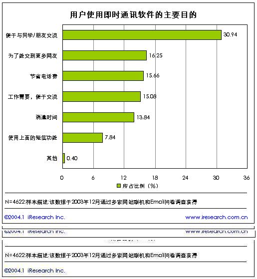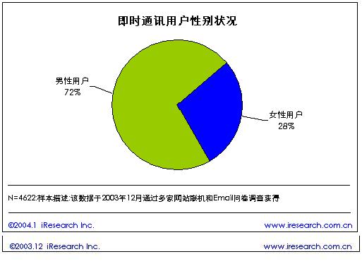 根據(jù)艾瑞市場咨詢(iResearch)的《2003年中國即時(shí)通訊研究報(bào)告》研究結(jié)果表明,在中國的即時(shí)通訊用戶中,72%的即時(shí)通訊用戶為男性,占據(jù)了大部分份額。女性用戶僅僅占28%?磥砟行跃W(wǎng)民更喜歡在網(wǎng)上聊天。