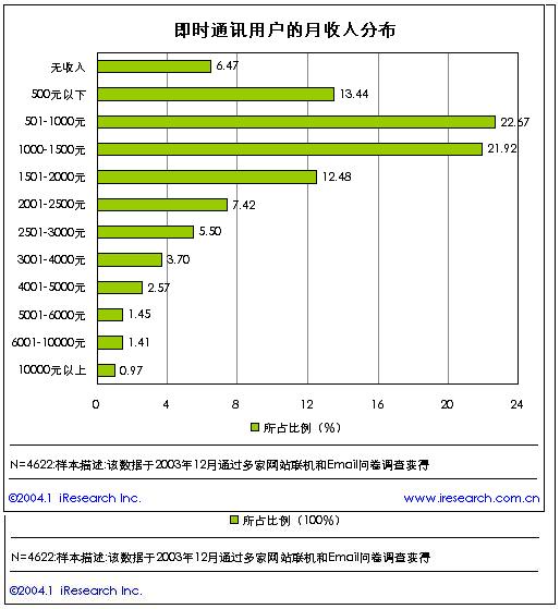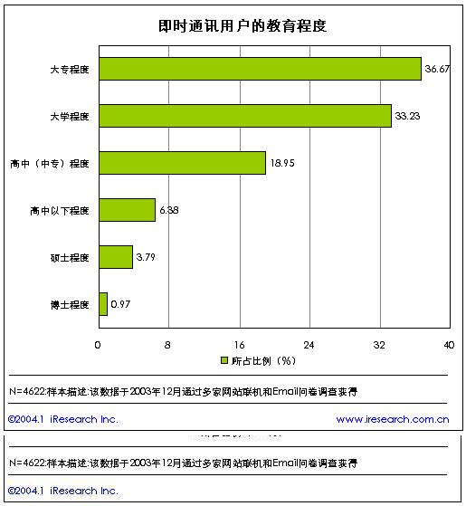 從即時(shí)通訊用戶的學(xué)歷水平來分析,在目前的即時(shí)通訊用戶中,大專以上教育程度的用戶比例達(dá)到了75%,占據(jù)了絕對高的比例。顯示出即時(shí)通訊用戶的整體教育水平非常高。