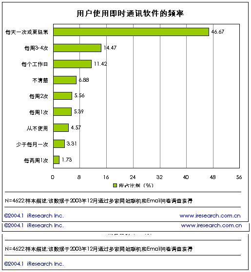 即時(shí)通訊所擁有的實(shí)時(shí)性、跨平臺(tái)性、成本低、效率高等諸多優(yōu)勢,使之成為網(wǎng)民們最喜愛的網(wǎng)絡(luò)溝通方式之一。從用戶使用即時(shí)通訊軟件的頻率來看,是比較高的。根據(jù)我們的調(diào)研結(jié)果,58%的用戶至少每天使用一次即時(shí)通訊軟件,使用頻率在每周一次以下的用戶比例僅為15%。