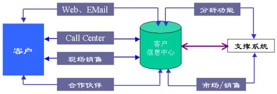 CRM系統(tǒng)的實施與企業(yè)的內(nèi)部和外部系統(tǒng)緊密相關(guān)。其涉及市場、營銷、銷售、實施、客戶服務(wù)與支持等一系列循環(huán)過程。一個完整的CRM系統(tǒng)不僅包含與客戶的多方位的多渠道接觸外,還包含市場的定位和分割,營銷策略的制定和客戶細(xì)分,銷售機(jī)會的把握,銷售的執(zhí)行(任務(wù)分派,任務(wù)的跟蹤),客戶的管理與分析,客戶的反饋與策略的評判等。從而再重新修正市場策略。這樣一個循環(huán)過程涉及管理、市場、客戶、產(chǎn)品、數(shù)據(jù)分析與處理等多學(xué)科的知識與技術(shù)。