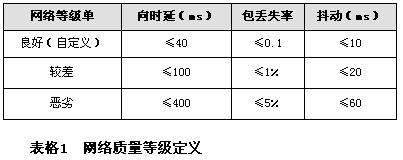 描述承載網(wǎng)性能指標的參數(shù)主要有帶寬、時延、時延抖動、丟包率等,其中帶寬是一個基本要求,必須滿足規(guī)劃的帶寬要求。根據(jù)通信行業(yè)標準YD/T1071-2000《IP電話網(wǎng)關(guān)設(shè)備技術(shù)要求》,網(wǎng)絡質(zhì)量可以分為以下三級: