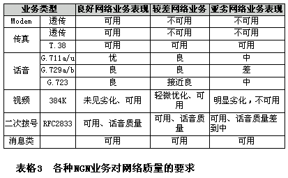 經(jīng)過試驗測試,對不同網(wǎng)絡質(zhì)量下的NGN業(yè)務表現(xiàn)總結(jié)如下表所示: