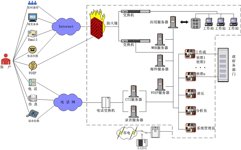 1.呼叫中心:提供傳統(tǒng)呼叫中心功能,實現(xiàn)電話網(wǎng)絡的呼入呼出、座席管理和數(shù)據(jù)庫維護等;