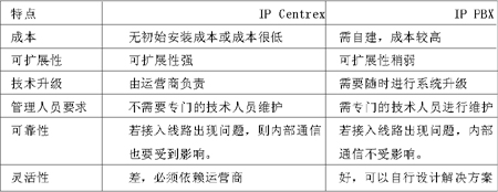 運營商自然不會聽之任之,因此推出了IP Centrex業(yè)務(wù)與其相抗衡。由附表可以很明顯地看出,與IP PBX相比,IP Centrex的優(yōu)勢有:初期投入成本小、以辦公費用方式容易控制現(xiàn)金流;無須對網(wǎng)絡(luò)、業(yè)務(wù)平臺進(jìn)行維護(hù);平臺規(guī)模與公司規(guī)模同步增長;具有對公網(wǎng)的開放性;辦公地點的任意性、易擴展;使企業(yè)集中在主營業(yè)務(wù)領(lǐng)域;業(yè)務(wù)可擴展性好。