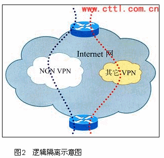 從圖2可以看出,邏輯隔離是在現(xiàn)有的運(yùn)營(yíng)商數(shù)據(jù)網(wǎng)基礎(chǔ)上,利用已經(jīng)比較成熟的VPN(如MPLSVPN)技術(shù)將網(wǎng)絡(luò)資源進(jìn)行隔離:將網(wǎng)絡(luò)劃分為兩個(gè)邏輯子網(wǎng),一個(gè)是Internet業(yè)務(wù)子網(wǎng),另一個(gè)是NGN業(yè)務(wù)子網(wǎng)。兩個(gè)子網(wǎng)通過(guò)VPN進(jìn)行隔離。NGN業(yè)務(wù)與Internet業(yè)務(wù)的區(qū)分在邊緣路由器PE上完成,PE根據(jù)物理接口或邏輯接口區(qū)分業(yè)務(wù)的類(lèi)型,邏輯接口可以是VLAN,PVC等。在NGN子網(wǎng)中,再有針對(duì)的對(duì)QoS以及安全等問(wèn)題進(jìn)行解決。