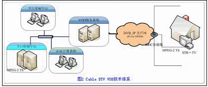 有線數(shù)字電視的廣播網采取的是hfc網絡體系,與傳統(tǒng)的模擬有線電視網絡體系架構相同,而開展新型的交互式業(yè)務情況下(如vod),網絡體系會有所不同。下面主要分析有線數(shù)字電視vod系統(tǒng)的技術架構: