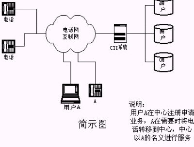 該業(yè)務(wù)方法涉及一種用戶電話轉(zhuǎn)移到CTI(Computer Telephony Integration)語音服務(wù)系統(tǒng)的接續(xù)服務(wù)方法,其CTI系統(tǒng)通過接口連接于公用電話網(wǎng),用戶在CTI系統(tǒng)登記,選擇服務(wù)功能,相關(guān)信息存入數(shù)據(jù)庫,用戶電話設(shè)置轉(zhuǎn)移;當(dāng)客戶呼叫已轉(zhuǎn)移用戶電話時(shí),自動(dòng)接入CTI語音系統(tǒng),請(qǐng)求相關(guān)信息,對(duì)信息進(jìn)行分析判斷、處理,查詢數(shù)據(jù)庫用戶信息,以用戶名義進(jìn)行接續(xù)服務(wù)。其完全避免了傳統(tǒng)CTI系統(tǒng)的專用特服號(hào)碼服務(wù)的弊端,充分利用了交換機(jī)的功能,以用戶的電話號(hào)碼為客戶提供語音、傳真、數(shù)據(jù)及人工接續(xù)服務(wù)。