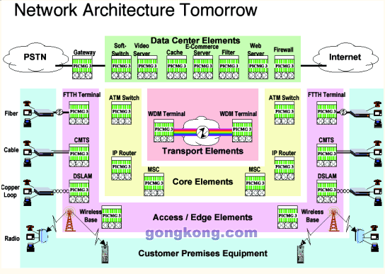 AdvancedTCA的設(shè)計(jì)目的就是作為電信應(yīng)用的高級計(jì)算平臺(tái),因此AdvancedTCA可以作為通用計(jì)算平臺(tái)在各種各樣的電信行業(yè)應(yīng)用中找到自己的位置,如下圖所示: