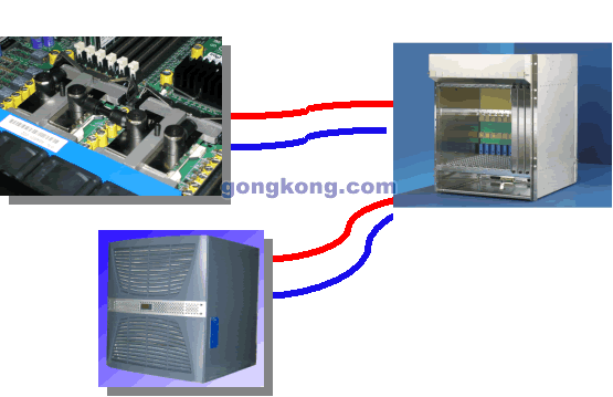散熱原理: 由工業(yè)空調(diào)提供冷卻循環(huán)水,板卡上的“熱點(diǎn)”安裝液體散熱片,散熱片通過循環(huán)管道以及特殊連接器與背板連接,背板上由特殊連接器通過循環(huán)管道與工業(yè)空調(diào)的循環(huán)系統(tǒng)相連。板卡可以正常插拔,不會(huì)牽連循環(huán)管道。
