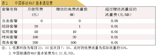 1X的優(yōu)勢是技術(shù)先進(jìn),速度快,但部分地區(qū)網(wǎng)絡(luò)覆蓋不足,開通國際漫游數(shù)據(jù)業(yè)務(wù)的國家少。此外,在收費(fèi)上雙方也有不同。表2是中國移動(dòng)與中國聯(lián)通WAP基本通信費(fèi)比較(各省之間略有不同)。