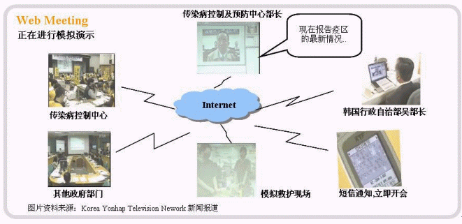 在韓國已經(jīng)安排多次的模擬演示,當疫情在韓國發(fā)生及蔓延時,由韓國傳染病控制及預防中心發(fā)出開會通知,召集其他緊急醫(yī)療機構(gòu)、專家及政府部門(如行政自治部)等,一起進行視像會議。在會議上,傳染病控制中心將各地收集回來的最新情況及報表共享給參會人及團體。由各專家一起分析現(xiàn)況,進行討論、判斷及決定解決辦法及措施。同時要求其他政府部門協(xié)調(diào)與全力幫助,目的是將疫情在最短的時間及在最少的范圍內(nèi)得到控制及處理,減少對人民生命安全及國家損失的影響。先進的通訊科技能加快對危機發(fā)生時,政府相關(guān)部門及機構(gòu)對事件的了解、分析、處理及決策,準確傳達信息、加強信息的交流、提高辦事效率、加快決策速度以及落實措施及處理方法的執(zhí)行。最重要的事,將各方面的損失降到最低的程度,避免了事情的惡化及波及其他范圍的負面影響。