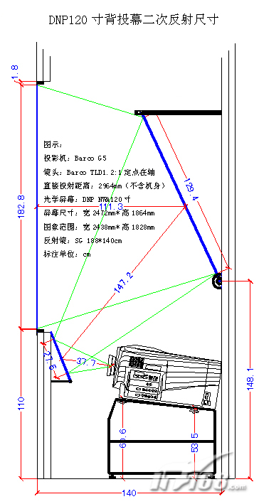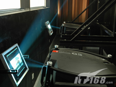 為了達到足夠大的尺寸,主屏幕采用SEAPRINE圖像控制器組成的1*2拼接,也就是采用了兩臺BARCO G5投影機來確保畫面的一流效果。不過由于投影距離的限制,這個方案里采用了二次反射系統(tǒng)。這也是這套方案的一個要點和關鍵。因為很多工程師利用一些概率來估算一次或多次折射可以縮短的投影距離,但欠缺科學和嚴謹?shù)膽B(tài)度,因為這個數(shù)據(jù)與屏幕安裝高度、投影方式(離軸或偏軸)、投影機體積、反射鏡面積等息息相關。