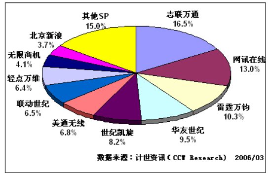 計(jì)世資訊(CCW Research)數(shù)據(jù)顯示:從各SP的收入構(gòu)成來看,IVR業(yè)務(wù)的市場(chǎng)集中度非常高。以中國聯(lián)通為例,收入前10位的SP有:志聯(lián)萬通、網(wǎng)訊在線、雷霆萬鈞、華友世紀(jì)、世紀(jì)凱旋、美通無線、聯(lián)動(dòng)世紀(jì)、輕點(diǎn)萬維、無限商機(jī)、北京新浪,他們的總收入占到聯(lián)通全部IVR業(yè)務(wù)收入的85%。