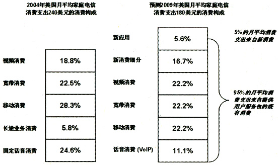 作為可以提供整合平臺(tái)的服務(wù),IMS在消費(fèi)者和企業(yè)應(yīng)用上都會(huì)為運(yùn)營(yíng)商帶來(lái)收入的增長(zhǎng)。首先分析IMS可能為消費(fèi)者帶來(lái)的收入增長(zhǎng)。比較美國(guó)2004年和2009年預(yù)計(jì)的電信消費(fèi)支出構(gòu)成。2009年,95%的消費(fèi)支出仍然是既有的業(yè)務(wù),運(yùn)營(yíng)商通過(guò)提供業(yè)務(wù)包和服務(wù)包捆綁既有用戶(hù)群。5%的新消費(fèi)支出是IMS新應(yīng)用的主戰(zhàn)場(chǎng)。