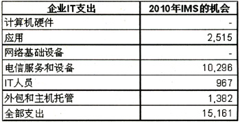2010年預(yù)計(jì)IMS應(yīng)用在企業(yè)中的收入機(jī)會(huì)(單位:百萬(wàn)美元)
