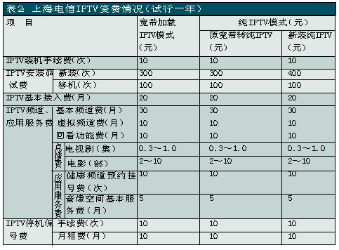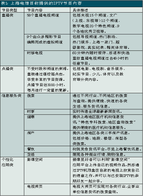 上海電信是國內(nèi)關(guān)注并切入IPTV業(yè)務(wù)較早的電信運(yùn)營商之一,自2005年就開始積極測試和試驗(yàn)。此次上海電信在全上海市范圍內(nèi)推出IPTV業(yè)務(wù),被業(yè)界看作是“中國IPTV規(guī)模商用的新紀(jì)元”。除了影視節(jié)目收看、視頻內(nèi)容點(diǎn)播、時移功能外,上海電信的IPTV服務(wù)還包括時事新聞、遠(yuǎn)程醫(yī)療、視頻房產(chǎn)信息、餐飲信息、天氣預(yù)報、票務(wù)查詢等信息服務(wù)以及可視電話、IPTV游戲等個性化應(yīng)用。其中IPTV的直播頻道有58個,視頻點(diǎn)播可選節(jié)目量達(dá)3000小時以上。另外,上海電信還推出了影像空間和電視大黃頁等應(yīng)用服務(wù),攝像愛好者可以利用“影像空間”應(yīng)用平臺上傳自己的視頻作品,然后通過IPTV機(jī)頂盒在自家的電視上欣賞自己的得意之作,并可以與已安裝IPTV的親朋好友一起分享;電視大黃頁可實(shí)現(xiàn)對各類行業(yè)、企事業(yè)單位信息資訊的搜索查詢。