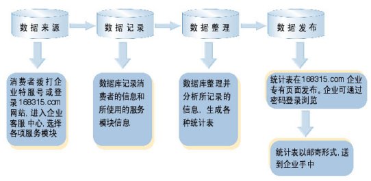"企業(yè)客戶服務(wù)系統(tǒng)"統(tǒng)計(jì)數(shù)據(jù)分析功能,能幫助企業(yè)管理人員適時(shí)監(jiān)控"企業(yè)客戶服務(wù)系統(tǒng)"的運(yùn)行情況,自動(dòng)采集消費(fèi)者在使用"企業(yè)客戶服務(wù)系統(tǒng)"過(guò)程的相關(guān)數(shù)據(jù),并分類整理成數(shù)據(jù)庫(kù),為企業(yè)經(jīng)理人投資決策提供重要的數(shù)據(jù)支持。企業(yè)經(jīng)理人只需登陸客戶服務(wù)網(wǎng)站www.168315.com,按照"168315客戶服務(wù)中心"提供的用戶名和密碼登錄,即可隨時(shí)下載"企業(yè)客戶服務(wù)系統(tǒng)"的運(yùn)行數(shù)據(jù),瀏覽客戶檔案庫(kù)。也可以由"中心"的服務(wù)人員將統(tǒng)計(jì)結(jié)果通過(guò)E-mail、傳真或郵寄的方式送到企業(yè)經(jīng)理人手中,如下圖: