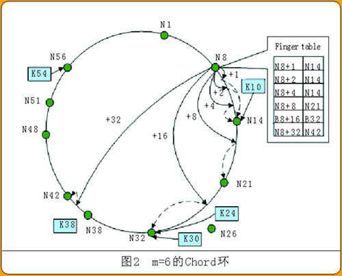這種查詢機制只要求節(jié)點知道順時針方向上自己后面那個節(jié)點的位置(自己的successor),查詢效率低,花費的平均時間是函數O(N/2)的值,N是Chord環(huán)的實際節(jié)點數。為提高查詢效率,Chord中每個節(jié)點除了記錄successor和predecessor(順時針方向上自己前面的那個節(jié)點)外,還要記錄m個其他節(jié)點。這m個節(jié)點由successor(n+2i-1)確定,其中n是本節(jié)點的哈希值,i是1到m間的整數。m個節(jié)點的集合就是finger表(圖2中給出N8的finger表)。這種方式下查詢資源花費的平均時間為O(logN)。