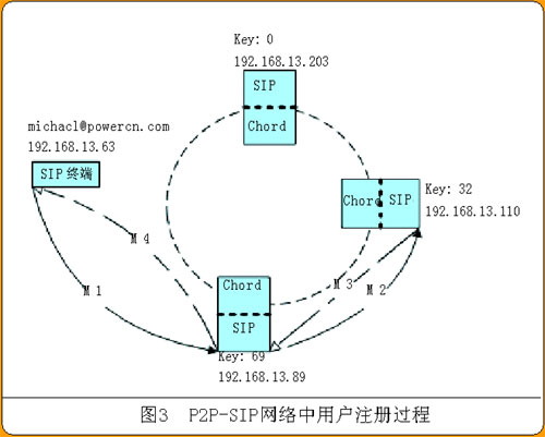 在本例中,SIP URI是michael@powercn.com,假定其哈希值是17,PN的Chord層會查找到負責處理該請求的PN Key值是32,find_responsible_pn(user)返回該PN的“IP地址∶端口”——192.168.13.110:5060。PN的SIP層比較該值發(fā)現不是自己,就將注冊請求轉發(fā)到該“IP地址∶端口”,如圖3中M2所示。