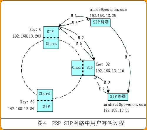 IP地址為192.168.13.26的用戶alice@powercn.com要呼叫用戶michael@powercn.com。alice可以把請求發(fā)給P2P-SIP網絡中任一PN?紤]到要在P2P-SIP網絡上提供增值業(yè)務(比如計費),alice把INVITE請求發(fā)給管理它的PN更合適一點,在本例中是IP為192.168.13.203,Key值為0的PN。如圖4中M1所示。