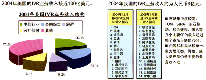 目前,國(guó)內(nèi)IVR的業(yè)務(wù)主要集中于為個(gè)人提供服務(wù)上,行業(yè)應(yīng)用所占比例較小,與成熟的國(guó)外市場(chǎng)以行業(yè)應(yīng)用為主的現(xiàn)狀形成巨大反差。而且,在為個(gè)人提供的語(yǔ)音業(yè)務(wù)中,國(guó)內(nèi)最受歡迎的仍是娛樂(lè)信息類中的聊天交友類業(yè)務(wù),這表明國(guó)內(nèi)個(gè)人用戶的需求層次較低;其次是娛樂(lè)和點(diǎn)播類的音樂(lè)類業(yè)務(wù);第三大類是游戲答題類,例如:知識(shí)競(jìng)猜、有獎(jiǎng)競(jìng)猜、角色扮演游戲、互動(dòng)游戲等;另外,IVR的數(shù)據(jù)業(yè)務(wù),如:短信、彩鈴、彩信等,受到近兩年國(guó)內(nèi)短信、彩鈴業(yè)務(wù)蓬勃發(fā)展的帶動(dòng),近兩年也呈現(xiàn)快速增長(zhǎng)的良好勢(shì)頭。