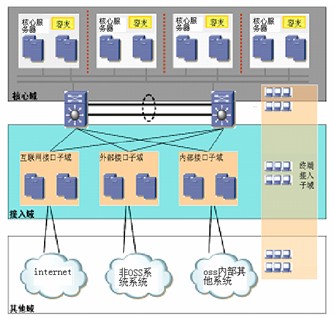 OSS管理者在保證及時(shí)準(zhǔn)確的提供信息服務(wù)的基礎(chǔ)上,應(yīng)該按不同的安全級(jí)別研究對(duì)安全域進(jìn)行劃分,確認(rèn)那些為核心子域,那些為接入域,那些為其他域。通過對(duì)不同的安全域進(jìn)行不同的安全策略劃分,保證如上的安全域所享受的安全級(jí)別是不同的。圖1顯示,核心域、接入域和其他域是第次接入的,向下訪問可以透明傳輸,而向上的訪問就必須設(shè)定相應(yīng)的訪問控制。