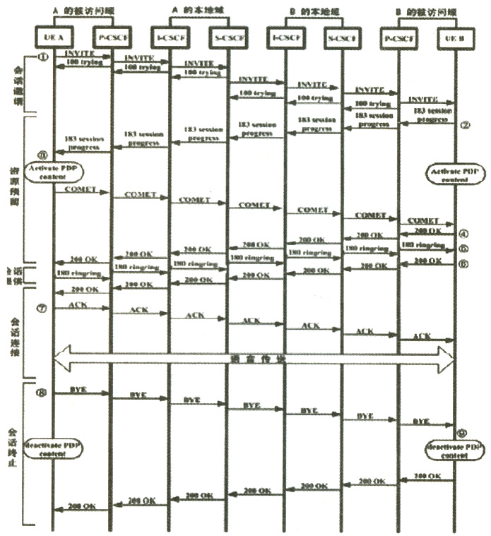 如圖4所示是最普通的兩個(gè)漫游用戶的會(huì)話建立過程。一個(gè)完整的IMS呼叫分為會(huì)話邀請(qǐng)、資源預(yù)留、會(huì)話提供、會(huì)話連接、會(huì)話終止五個(gè)階段。