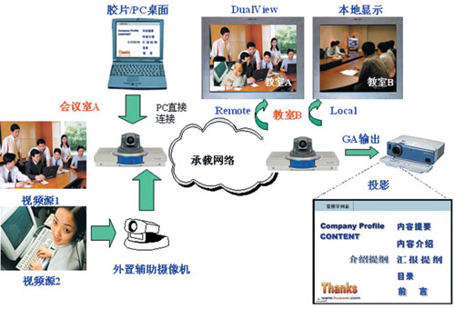 會議中常常需要同時傳送演講人的演講膠片和演講人的圖像,這套視訊系統(tǒng)非常方便地支持此功能,只需要把演講人的便攜機用線纜接到會場的終端上,通過終端的SXGA輸入功能可方便地將膠片信息發(fā)送到遠端會場,遠端會場通過終端的SXGA輸出接口將膠片內容通過投影設備顯示出來,而終端的主視頻輸出接口顯示的是遠端演講人的圖像。