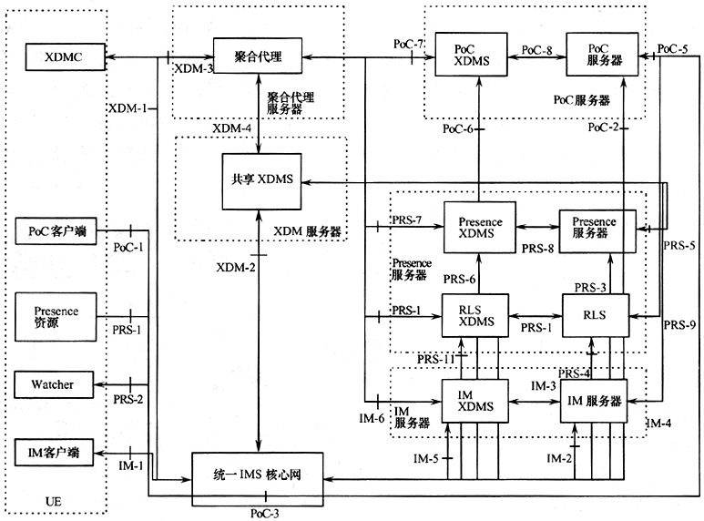 OMA雖然定義了XDM、Presence(呈現(xiàn))、Instant Message和PoC等業(yè)務(wù)的功能實(shí)體和參考點(diǎn),但是為了在網(wǎng)絡(luò)中實(shí)現(xiàn)以上業(yè)務(wù),需要將OMA定義的功能實(shí)體和參考點(diǎn)映射成物理實(shí)體和協(xié)議,確定運(yùn)營(yíng)商開(kāi)放此類(lèi)業(yè)務(wù)對(duì)設(shè)備和協(xié)議的要求,圖2給出了一種映射的方式。XDM服務(wù)器包含的共享XDMS功能提供公共群組的能力,有利于用戶(hù)在使用PoC、IM等業(yè)務(wù)時(shí)也能共享此群組。