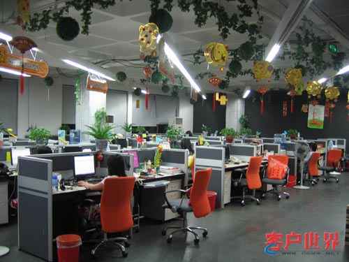 整個(gè)服務(wù)現(xiàn)場(chǎng)的裝修以桔黃色為主色調(diào),代表溫暖、和諧;格局不規(guī)則化,盡顯現(xiàn)代時(shí)尚的風(fēng)格;辦公室到處是綠色植物,墻上貼滿了各種相片、海報(bào)和宣傳語(yǔ),天花板掛滿了激勵(lì)口號(hào)板;別具特色的洗手間文化;乒乓球室、休息室、休閑吧,咖啡機(jī)、茶葉、果汁、雪糕、飲料,魚缸、大液晶電視、音響……一點(diǎn)感覺不到這是一個(gè)枯燥的呼叫中心的工作環(huán)境。