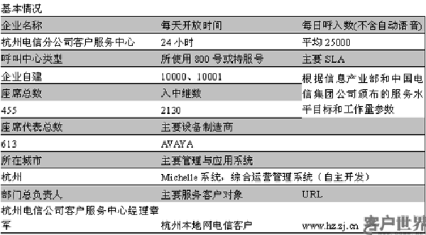浙江省電信有限公司杭州市分公司客戶服務(wù)中心(以下簡(jiǎn)稱杭州電信客服中心,或者杭州電信10000號(hào))成立于2002年9月,是一個(gè)基于CTI技術(shù)、充分利用通信網(wǎng)和計(jì)算機(jī)網(wǎng)絡(luò)的綜合信息服務(wù)系統(tǒng),以電話為主,輔之以傳真、短信、Email、互聯(lián)網(wǎng)等多種接觸媒體,通過(guò)人工、自助語(yǔ)音與網(wǎng)上服務(wù)的方式,為杭州400萬(wàn)電信客戶提供綜合電信業(yè)務(wù)的咨詢、查詢、受理、投訴、報(bào)障和電話營(yíng)銷。建有2130路中繼通道,1410路自動(dòng)語(yǔ)音通道,186個(gè)人工服務(wù)座席、189個(gè)電話營(yíng)銷座席、80個(gè)外包座席,占地5600多平米,分別位于杭州市惠興路9號(hào)和慶春路133號(hào)。