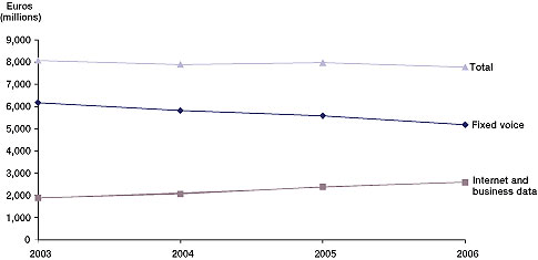 但問(wèn)題是,在發(fā)達(dá)國(guó)家,用戶(hù)寬帶接入市場(chǎng)已經(jīng)接近飽和。正因?yàn)槭沁@樣一種情況,所以用戶(hù)數(shù)量也就很難再有增加。ARPU值在極大的競(jìng)爭(zhēng)壓力下也很難有很大的突破。一切都靜止不動(dòng),固話收入持續(xù)下降,所以圖中的“'Internet