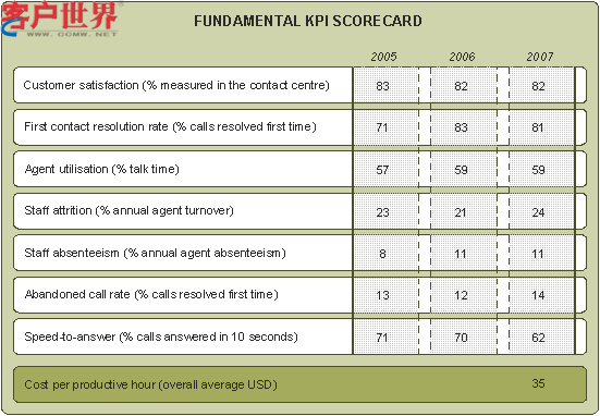 一次問題解決率的記分已經(jīng)作為定義和測量標(biāo)準(zhǔn)擁有了更高的協(xié)調(diào)性,但是人工座席利用率,生產(chǎn)力的代名詞,應(yīng)該受到更多的關(guān)注,因?yàn)樗呛侠硪?guī)劃和管理資源的一個重要體現(xiàn)。員工離職率測評的是平均年流失率,是檢測人力資源管理效率的一項(xiàng)重要指標(biāo)。除了像處理今年24%的流失率所付出的高成本和努力外,客戶服務(wù)的間接成本也是值得注意的。員工曠工對企業(yè)來說是無法計算的損失。注重激情,提高滿意度和激發(fā)員工的主動性是解決這項(xiàng)問題的關(guān)鍵點(diǎn)。電話放棄率統(tǒng)計顯示有十分之一的來電者會放棄再次來電,因此呼叫中心要滿足客戶的期望還有很長的路要走。接聽速度的記分統(tǒng)計中10秒的接聽記錄有所下降,但是20秒的接聽標(biāo)準(zhǔn)有整體的提高。生產(chǎn)小時成本是計算提供特定服務(wù)實(shí)際成本的標(biāo)準(zhǔn)尺度,同時也是了解呼叫中心每個生產(chǎn)小時所需的投資成本的重要依據(jù)。