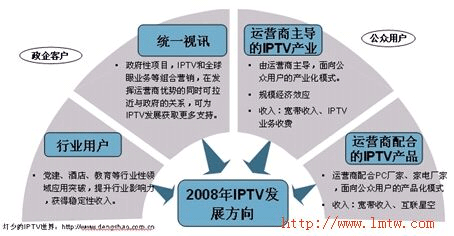 2008年,IPTV市場(chǎng),因?yàn)榘l(fā)展速度明顯慢于了市場(chǎng)進(jìn)度和技術(shù)演進(jìn)。因此在原有的運(yùn)營商產(chǎn)業(yè)化推動(dòng)形勢(shì)下,終端廠家推動(dòng)下的產(chǎn)品化發(fā)展模式也會(huì)得到更大的發(fā)展空間,而這在一定程度上雖會(huì)推動(dòng)用戶對(duì)IPTV的認(rèn)知度,同時(shí)也會(huì)分化一部分IPTV產(chǎn)業(yè)化的動(dòng)力。