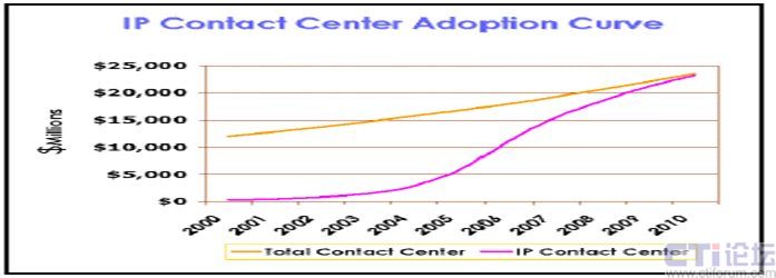 支持多渠道上的聯(lián)系以及降低集中網(wǎng)絡和標準硬件的成本的需求構(gòu)成了IP技術的主要推動力。正如當前通訊網(wǎng)絡領域內(nèi)正在進行的從回路到IP的技術轉(zhuǎn)移一樣,在聯(lián)系中心技術的領域也有相應的轉(zhuǎn)移。下圖描述了這一轉(zhuǎn)移,根據(jù)現(xiàn)有數(shù)據(jù)外推并預測了直至2010年世界范圍內(nèi)投資于聯(lián)系中心IP技術的金額以及所占整個聯(lián)系中心投資的比例。