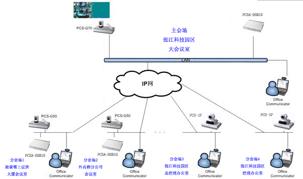 在此方案中,在張江科技園區(qū)大會議室配置一套SONY PCS-G70旗艦型視頻會議終端。并在此終端內安裝了支持6點多點會議的H.323內置多點MCU。